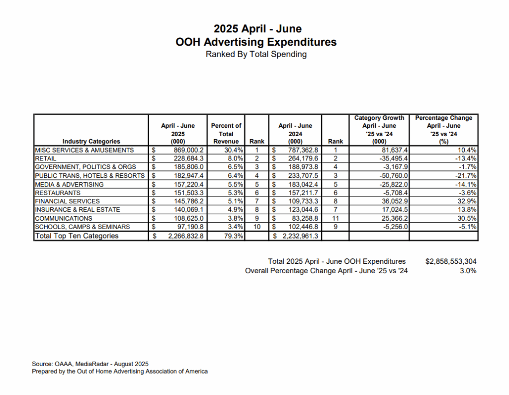 Out of home (OOH) advertising posted its 17th consecutive quarter of growth, increasing 3% year-over-year to $2.86 billion in Q2 2025. Year-to-date, OOH revenue is up 2.6%.