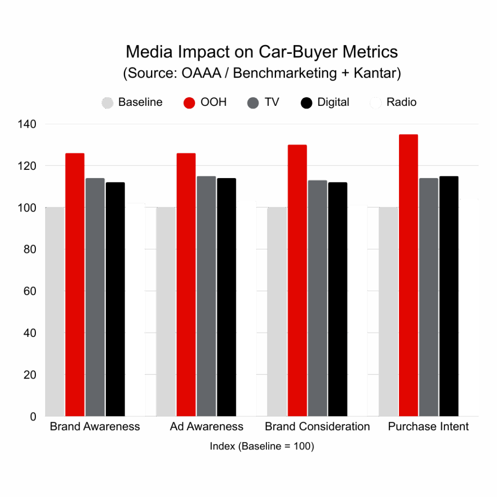 Out-of-home advertising can improve consumer perceptions of brand quality and reliability. Studies show that OOH can boost brand recall by up to 47% compared to digital-only ads. When someone is making a big purchase like a car, seeing a trusted brand over and over can reduce hesitation and increase the likelihood of a visit or purchase.